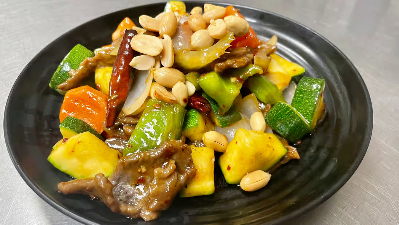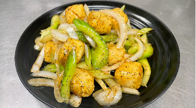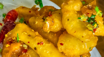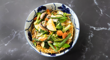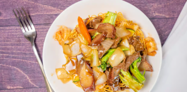 Crispy noodles dishes made with fried eggs noodles with gravy on top.