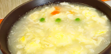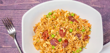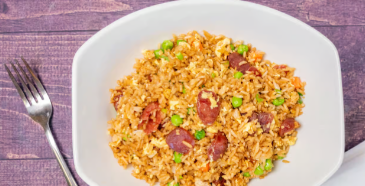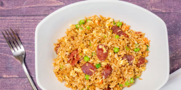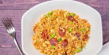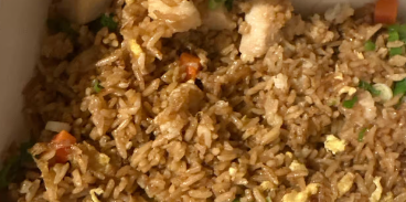 Fried rice dishes made with eggs, peas, carrots, scallion and soy sauce.