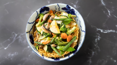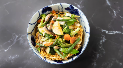 Lo mein dishes made with soft noodles, cabbage, onion, scallion and cashews.