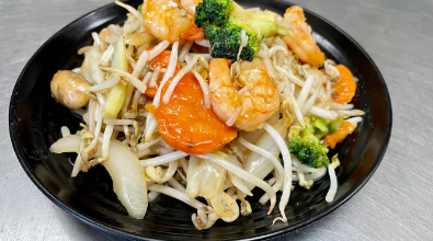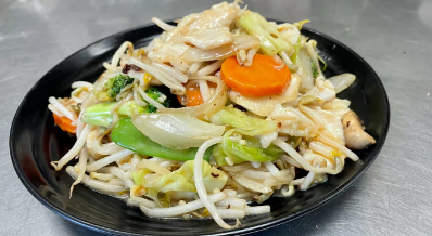 Chow fun dishes made w/ flat rice noodles, soy sauce, onion, scallion, bean sprouts.
